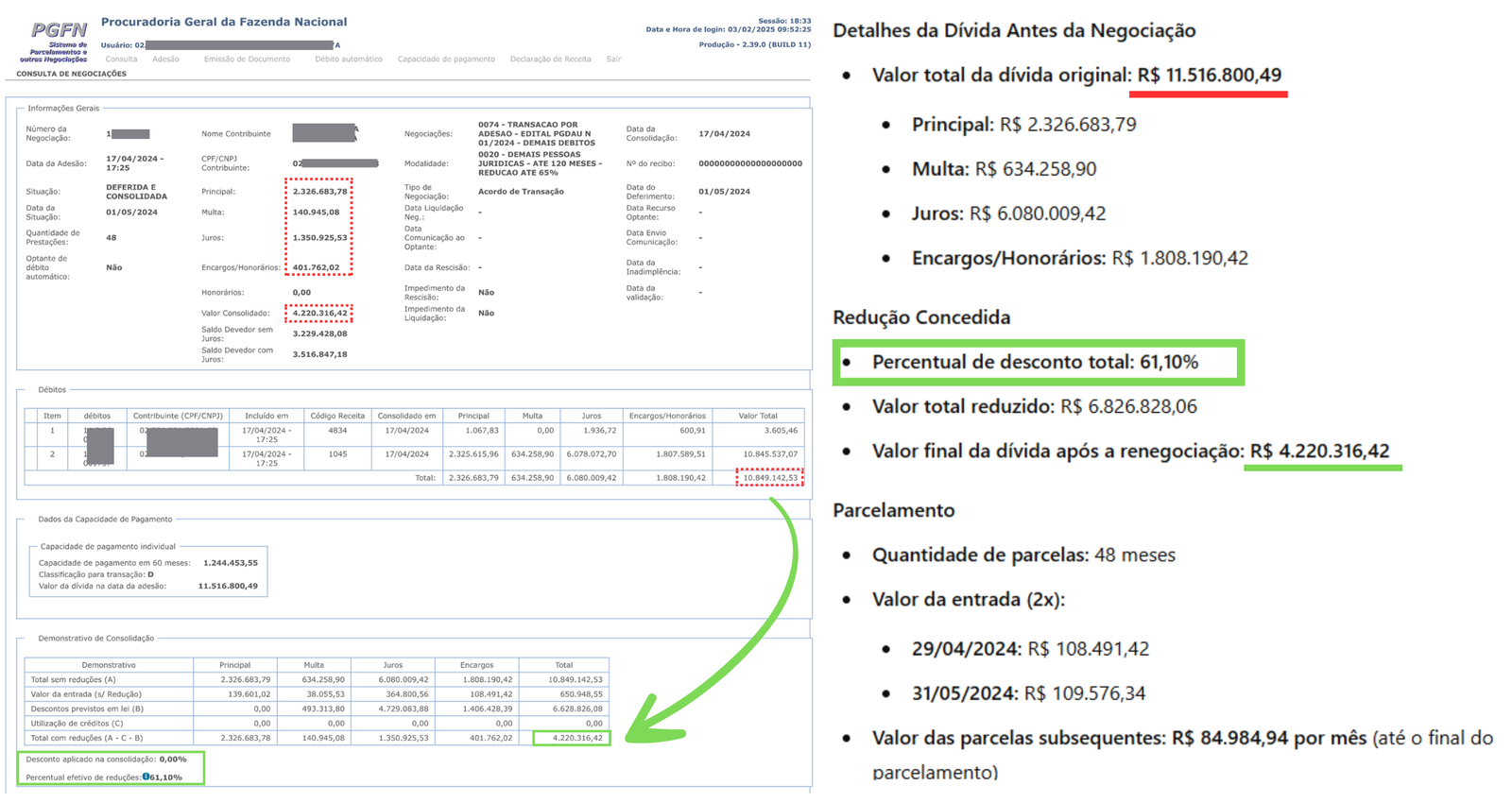 Aplicação de descontos e extenção do prazo para 120/145 meses conforme o caso.